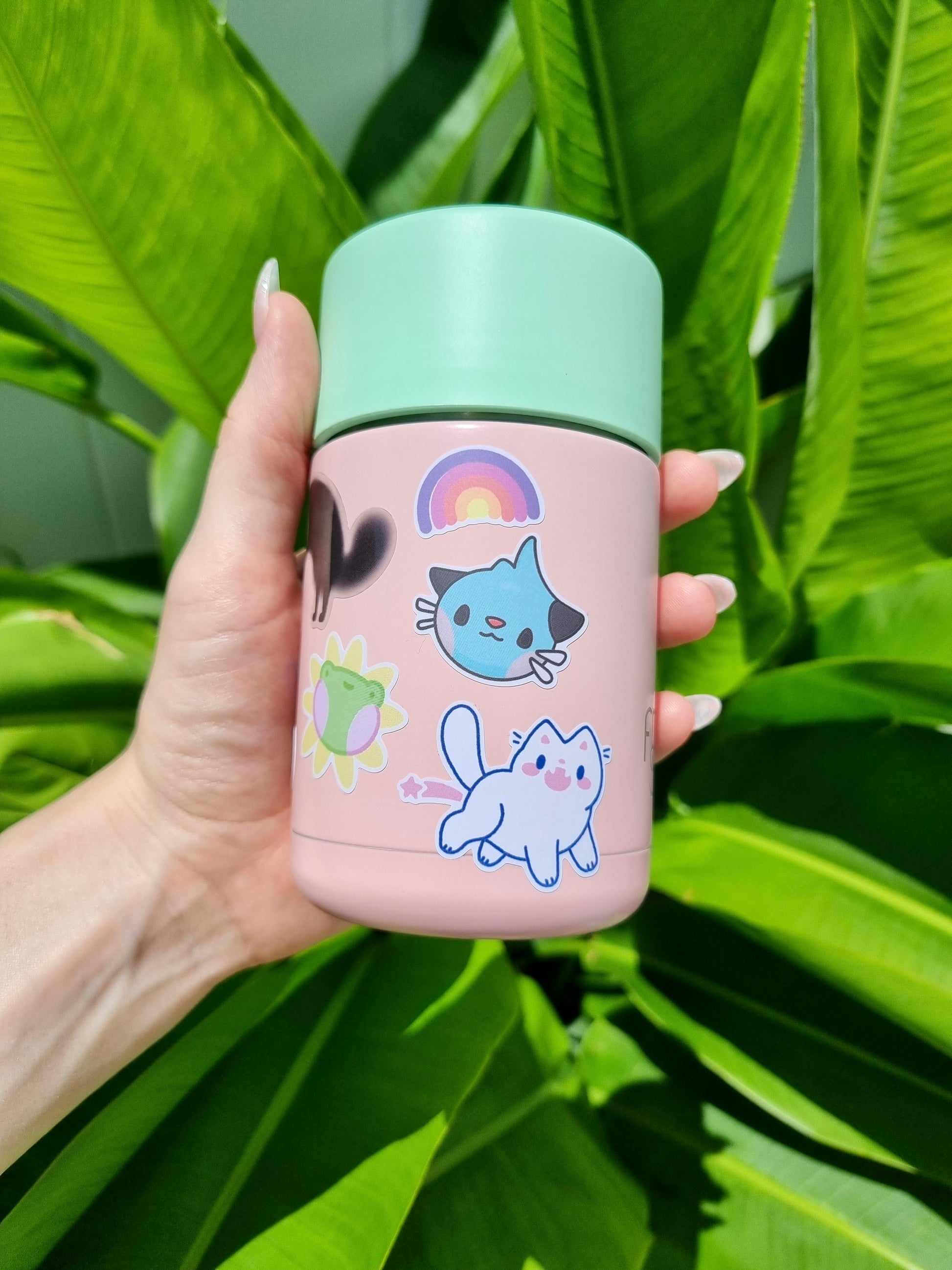 This sicker sheet features white cats in space with a pink moon, planet and stars.